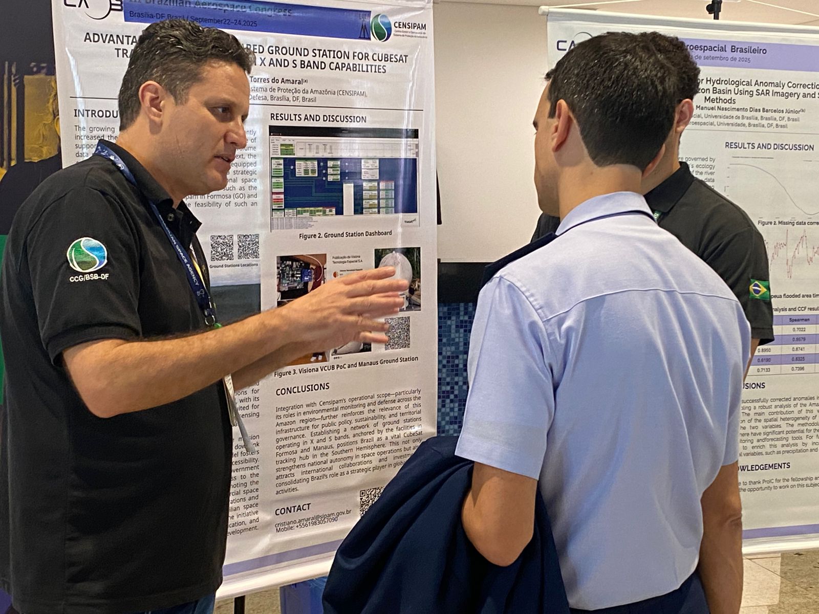 Brasília (DF), 23/09/2025 – O Centro Gestor e Operacional do Sistema de Proteção da Amazônia (Censipam) marcou presença no III Congresso Aeroespacial Brasileiro (CAB), realizado de 22 a 24 de setembro, com a exposição de um cartaz técnico apresentada pelo analista Cristiano Torres do Amaral, acompanhado do estagiário Murilo Henrique Silva Santos, ambos da Coordenação-Geral de Sensores e Inovação.