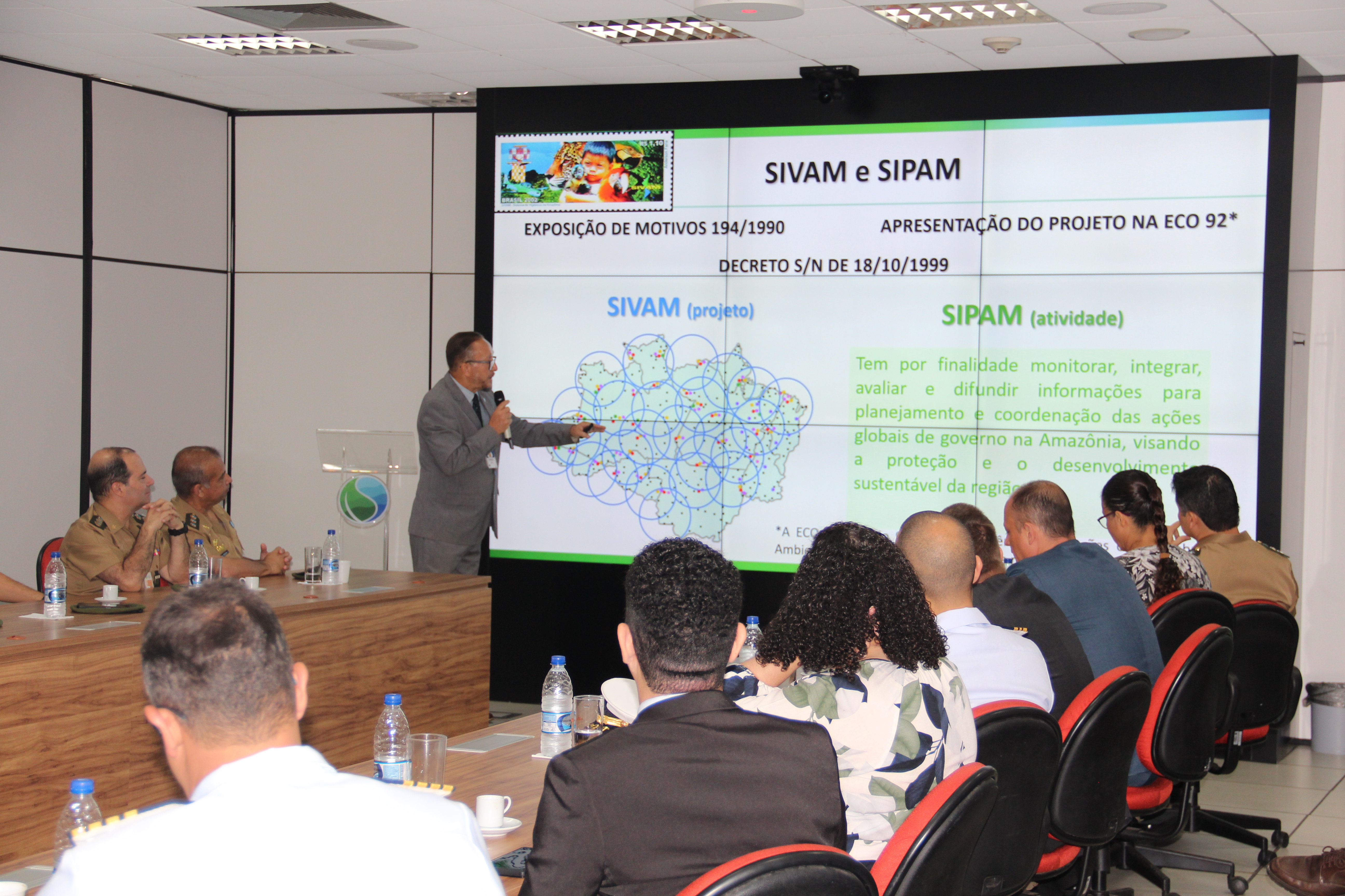 Em seguida, o Coordenador-Geral de Inteligência, Raimundo Camargos, ministrou palestra institucional sobre os projetos e produtos desenvolvidos pelo Censipam. Foram apresentados os monitoramentos ambientais, as ações de combate a ilícitos e a contribuição do órgão para o desenvolvimento sustentável da região, com ênfase na integração entre órgãos civis e militares.