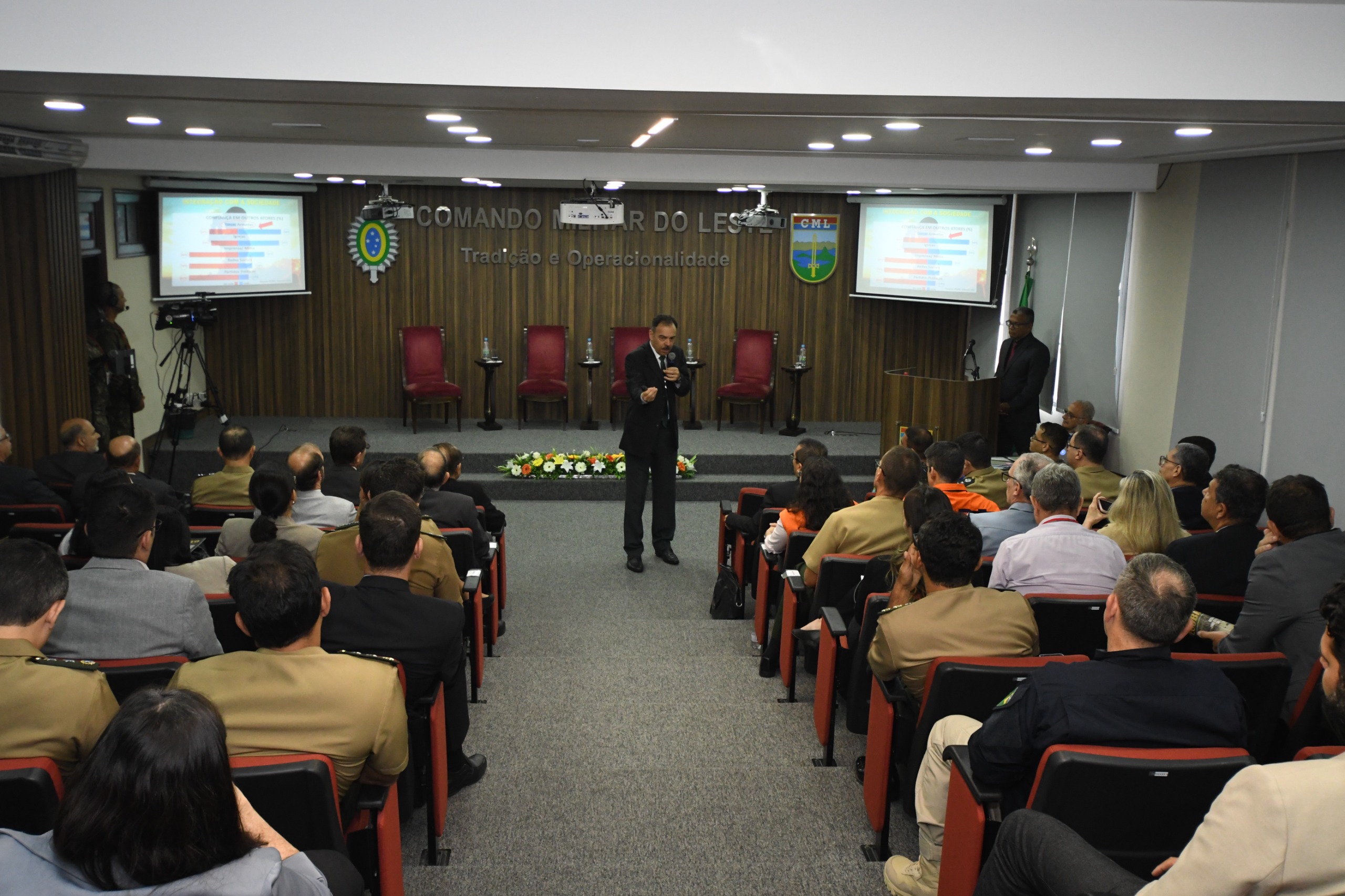 A moderação do painel foi conduzida pelo General de Brigada R/1 Nilton José Batista Moreno Júnior, Assessor Especial do CML, e pelo Professor Dr. Sandro Teixeira (Instituto Meira Mattos/ECEME), garantindo fluidez e integração entre os temas.