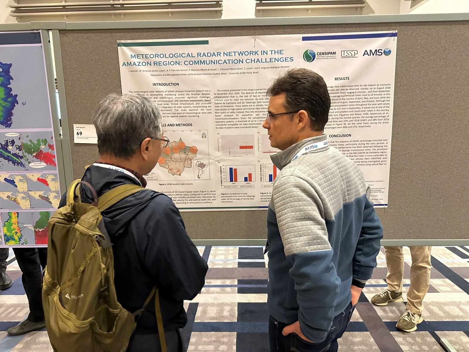 Os servidores Márcio Nirlando e Ivan Saraiva apresentaram o trabalho “Rede de Radares Meteorológicos na Região Amazônica – Desafios de Comunicação”, no qual destacaram os obstáculos técnicos e operacionais relacionados à transmissão de dados em áreas remotas. A participação reforçou a relevância estratégica do Censipam no monitoramento atmosférico e na produção de informações críticas para a tomada de decisão em nível nacional.