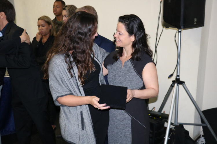 Foto da pesquisadora Monica Castoldi Borlini Gadioli (à direita) sendo homenageada com o Destaque em Menção Honrosa na 15ª Semana Estadual de Ciência e Tecnologia, em Vila Velha, Espírito Santo