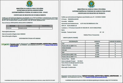 Figura 1: Certificado de Registro de Estabelecimento (à esquerda) e Certificado de Registro de Produto Remineralizador (à direita) concedidos pelo Ministério da Agricultura, Pecuária e Abastecimento - MAPA a empresa Alto Vale Mineração LTDA, de Trombudo Central – SC, a partir do Relatório de Eficiência Agronômica desenvolvido pelo Centro de Tecnologia Mineral/Núcleo Regional do Espírito Santo – CETEM-NRES.