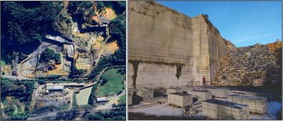 Figura 2: vista aérea (à esquerda) e frente de lavra (à direita) da empresa Alto Vale Mineração LTDA, em Trombudo Central – SC