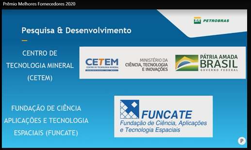 O CETEM e a Funcate recebem Prêmio PETROBRAS de Fornecedores na categoria de Pesquisa e Desenvolvimento 2020.
