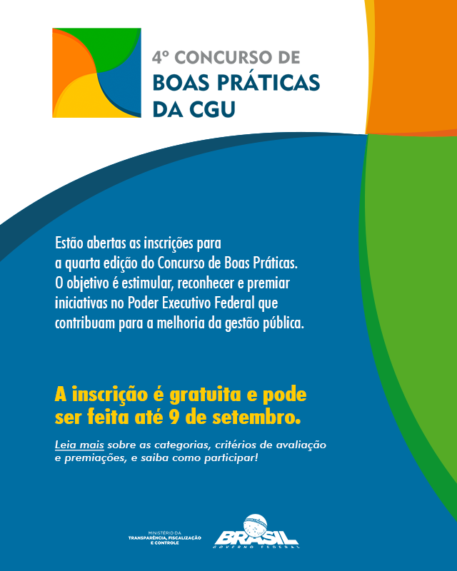O Ministério da Transparência disponibiliza quatro peças de divulgação do Concurso de Boas Práticas. Caso as dimensões dos banners não correspondam ao espaço disponível, entre em contato conosco pelo e-mail: internet@cgu.gov.br .