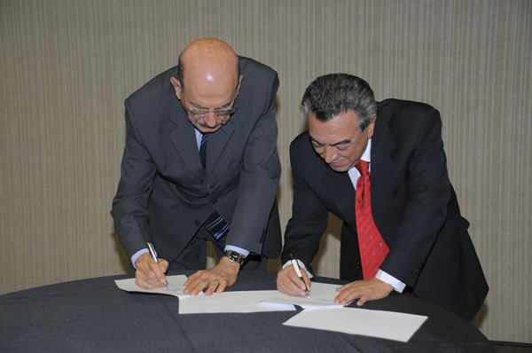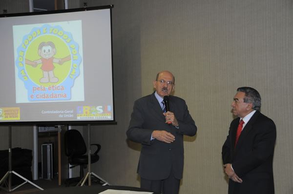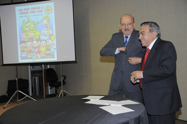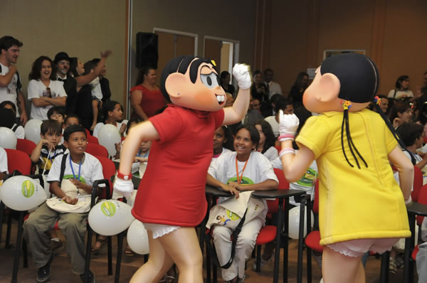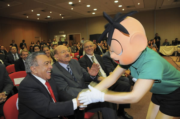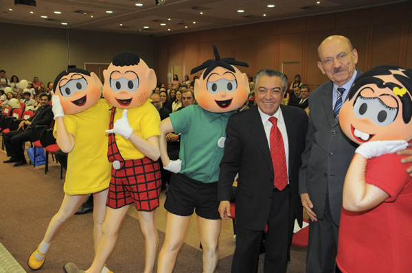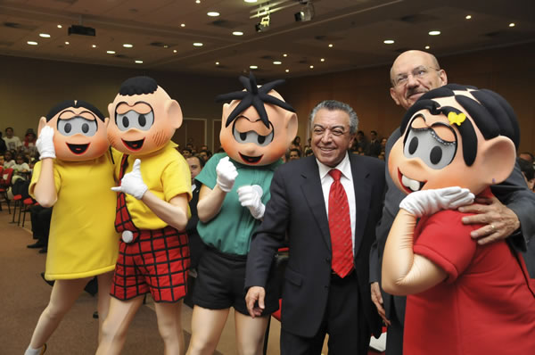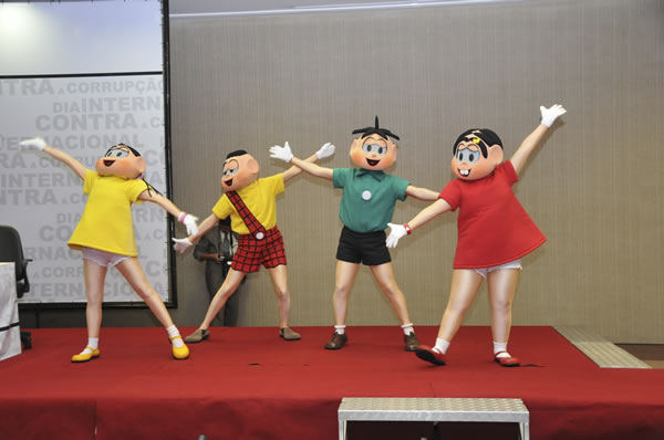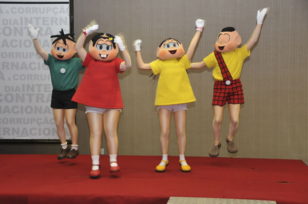 Fotos da assinatura do convênio entre a CGU e o Instituto Mauricio de Sousa e da apresentação dos personagens da Turma da Mônica