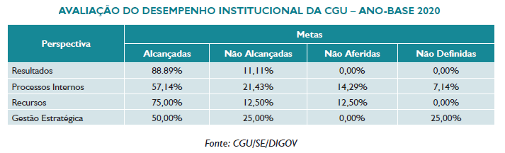 A partir de cada perspectiva do Mapa Estratégico da CGU – de Resultados, de Processos Internos, de Recursos e de Gestão Estratégica –, foram avaliados os resultados dos objetivos estratégicos, por meio da apreciação das metas e dos indicadores definidos para o quadriênio 2020-2023, por meio da Portaria nº 455/2021 .