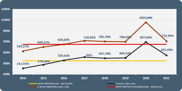 Assim, os limites estabelecidos na LRF para os demonstrativos de pessoal, das garantias e contragarantias e das operações de crédito foram cumpridos no 3º quadrimestre de 2021 e a inscrição em RP não processados foi realizada com a suficiente disponibilidade de recursos. Ainda, os limites referenciais propostos pelo Poder Executivo para a Dívida Consolidada Líquida e para a Dívida Mobiliária, ainda não regulamentados pelo Senado e Congresso Nacional, encontra-se extrapolados desde 2016, alcançando no citado quadrimestre, 455,39% e 715,46% da RCL, respectivamente.