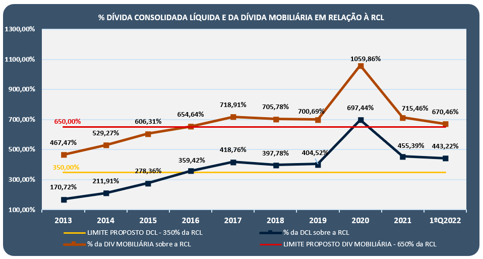 Assim, os limites estabelecidos na LRF para os demonstrativos de pessoal, das garantias e contragarantias e das operações de crédito foram cumpridos no 1º quadrimestre de 2022. Ainda, os limites referenciais propostos pelo Poder Executivo para a Dívida Consolidada Líquida e para a Dívida Mobiliária, ainda não regulamentados pelo Senado e Congresso Nacional, encontra-se extrapolados desde 2016, alcançando no citado quadrimestre, 443,22% e 670,46% da RCL, respectivamente.