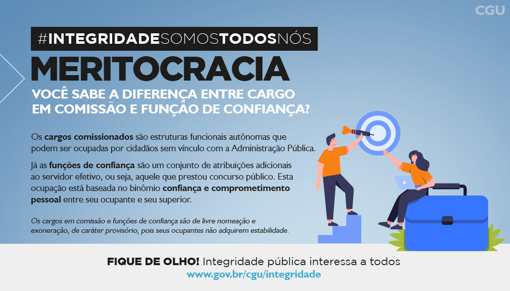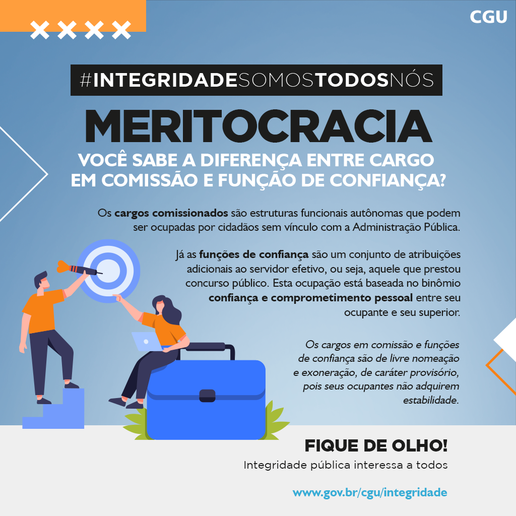 Nesta seção, serão divulgadas peças de comunicação do tema "Meritocracia". Aqui, é possível fazer o download de cards eletrônicos para redes sociais e whatsapp, bem como acessar vídeos (em português, libras e inglês) com explicações sobre o assunto. Os interessados podem conhecer também os folders explicativos para divulgação eletrônica ou impressa.