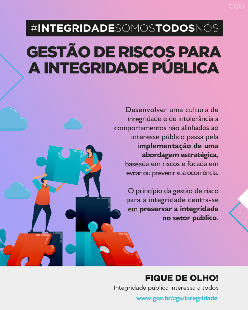 Nesta seção, serão divulgadas peças de comunicação do tema "Riscos para Integridade". Aqui, é possível fazer o download de cards eletrônicos para redes sociais e whatsapp, bem como acessar vídeos (em português, libras e inglês) com explicações sobre o assunto. Os interessados podem conhecer também os folders explicativos para divulgação eletrônica ou impressa.