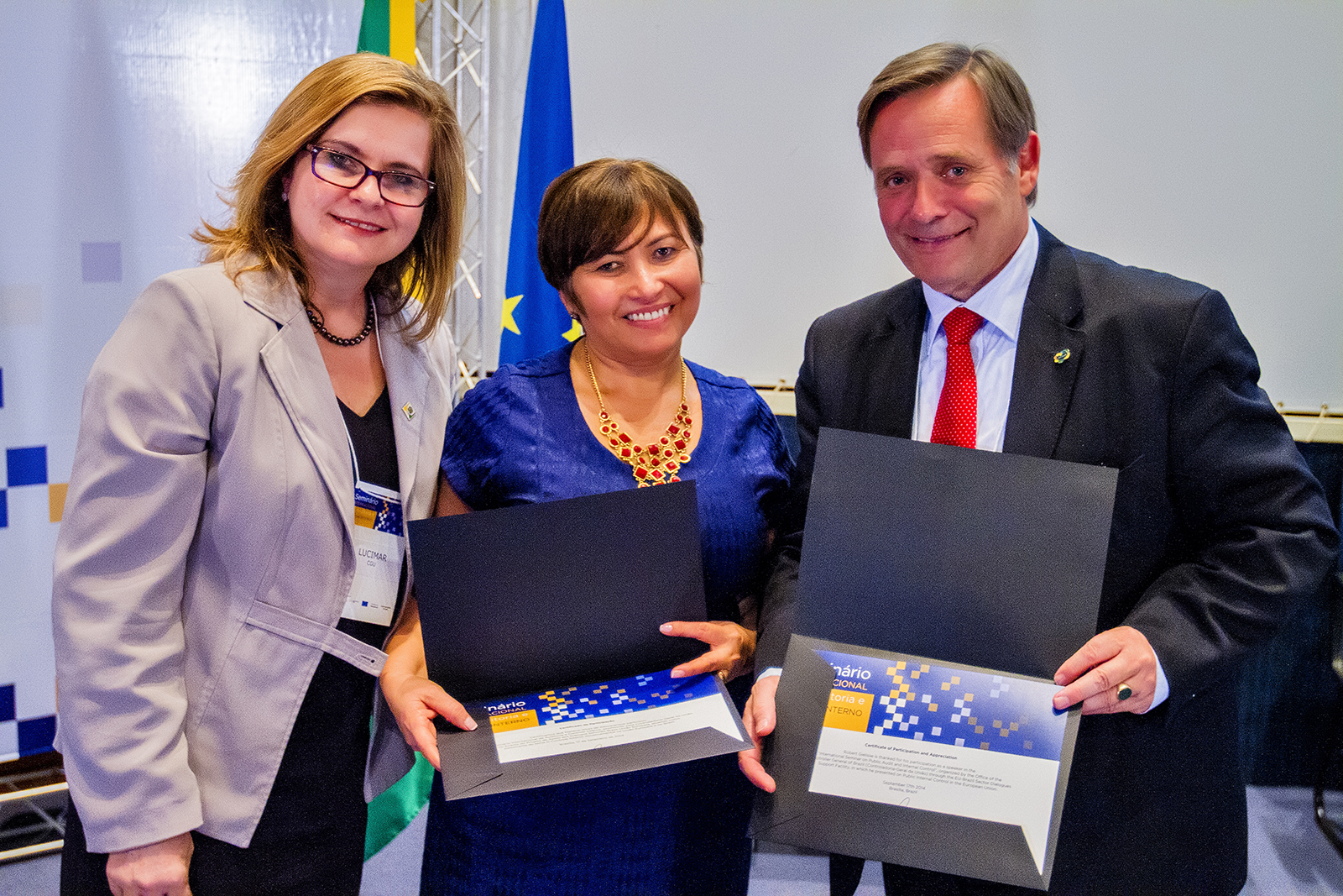 Da esquerda para direita: Diretora de Auditoria da Área de Produção e Tecnologia, Lucimar Mijan; Secretária Federal de Controle Interno Adjunta, Marlene de Albuquerque; e o Presidente da Rede de Controle Interno Público da União Europeia, Robert Gielisse.