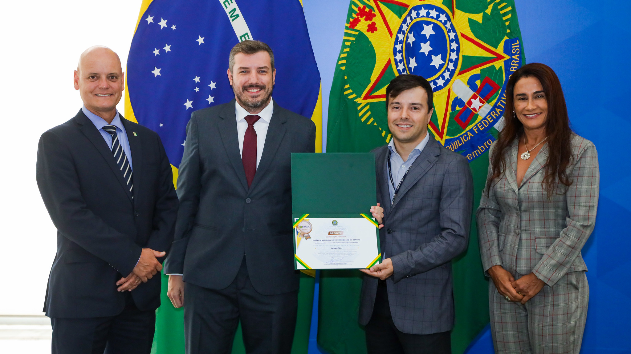 Sérgio Neiva, Wilson Yamaji e Gustavo Roriz, da DG/SFC, recebem certificado em solenidade no Palácio do Planalto