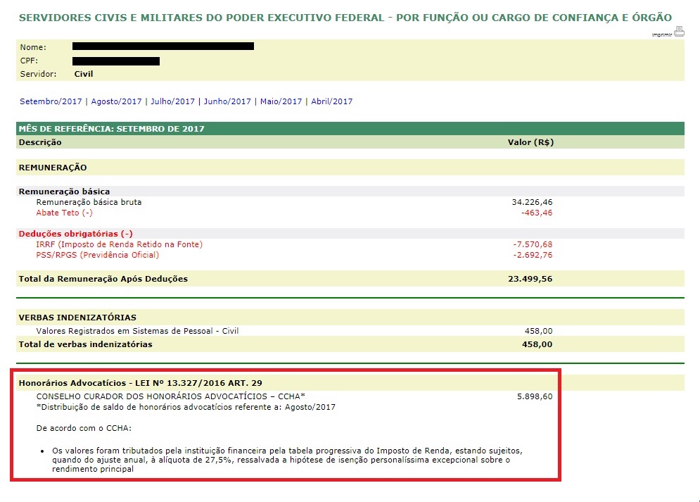 A pesquisa pode ser feita pelo nome ou CPF, órgão de exercício ou de lotação, por função ou cargo de confiança. Ao clicar na remuneração, o item estará discriminado ao lado da remuneração básica, deduções obrigatórias e verbas indenizatórias.