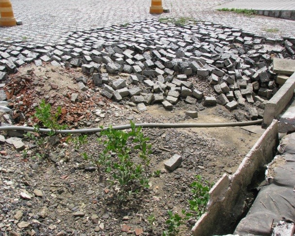Fragmentação da pavimentação em paralelepípedo em área que teria recebido o reforço de estacas granulares, no Terminal Pesqueiro Público de Cabedelo (PB).