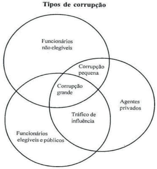 • CORRUPÇÃO GRANDE: envolve agentes privados em contato com altos escalões do governo (líderes políticos ou representantes eleitos e a burocracia ou funcionário não eleitos). Tratam-se das decisões governamentais que precisam do alto escalão para ser efetivadas, a saber: aquisição de altos valores – equipamentos militares, aviões civis ou obras de infraestrutura –, políticas de alocação de crédito ou subsídios industriais, e demais decisões envolvendo políticas públicas de grande impacto (ELLIOTT, 2002).