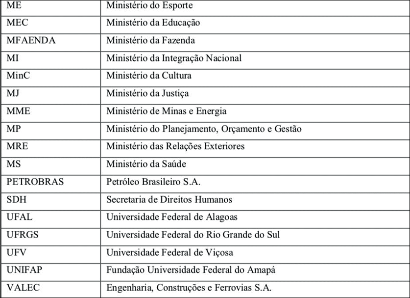 Dessa forma, em termos de órgãos a que se destinaram os pedidos de informação, apresentam-se tanto aqueles da Administração direta (ministérios, por exemplo), quanto da Administração indireta (autarquias e fundações), bem como empresas públicas e sociedades de economia mista – o que condiz com os arts 1º e 2º da Lei de Acesso à Informação. Logo, têm-se o quadro 01, com os órgãos: