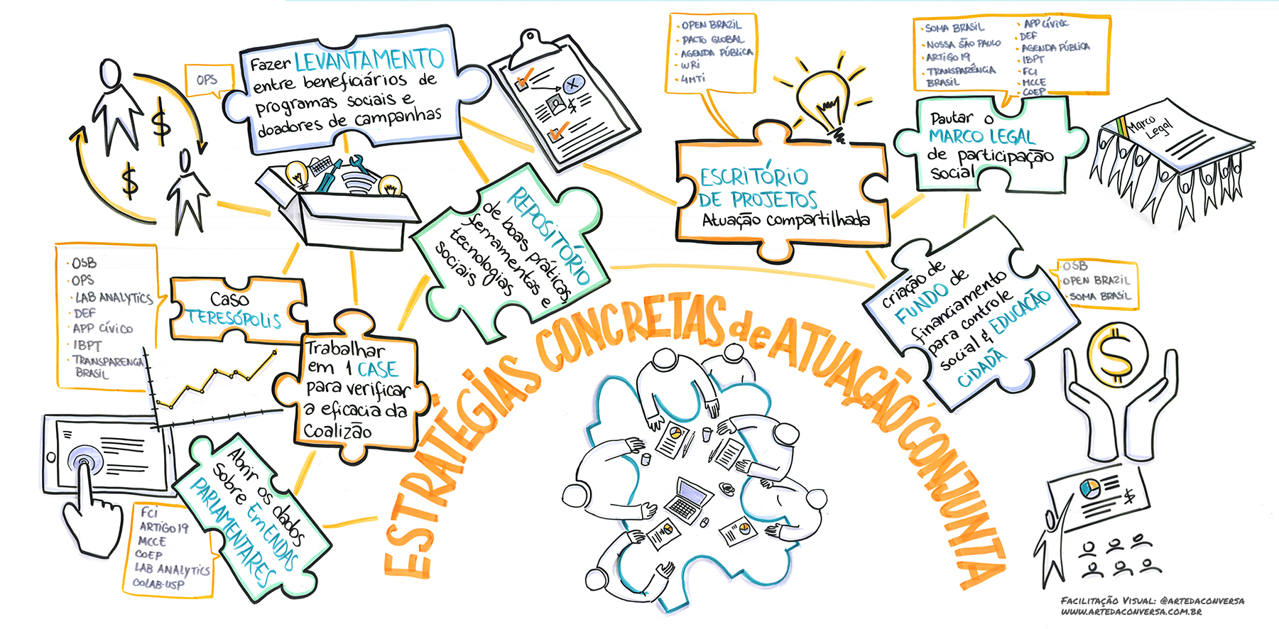Participaram das oficinas instituições provenientes de vários lugares do País: 4mti Soluções, Ação Jovem Brasil, Agenda Pública, Artigo 19 Brasil, AppCívico, COEP – Rede Nacional de Mobilização Social, COLAB – Colaboratório de Desenvolvimento e Participação /Universidade de São Paulo, Datapedia, Democracy Earth Foundation, Fundação Cidadania Inteligente, IBPT – Instituto Brasileiro de Planejamento e Tributação, Instituto de Fiscalização e Controle, Instituto Soma Brasil, Laboratório Analytics, MCCE – Movimento de Combate a Corrupção Eleitoral, Nossas Cidades, Núcleo de Estudos em Saúde Pública, Observatório Social do Brasil, Open Brazil / Code for Brazil, OPS – Operação Política Supervisionada, Operação Serenata de Amor, Rede Brasil do Pacto Global da ONU, Rede Nossa SP, Transparência Brasil e WRI Brasil.
