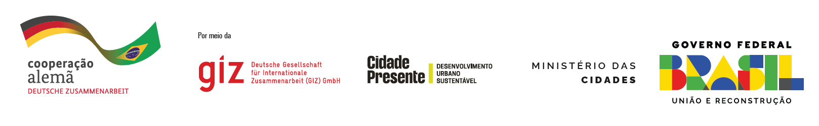 - Descrição da imagem: Marcas da parceria Brasil - Alemanha: Cooperação Alemã - Deutsche Zusammenarbeit, por meio da GIZ Deutsche Gesellschaft für Internationale Zusammenarbeit (GIZ) GmbH; Cidade Presente - Desenvolvimento Urbano Sustentável; Ministério das Cidades; Governo Federal - Brasil, União e Reconstrução.