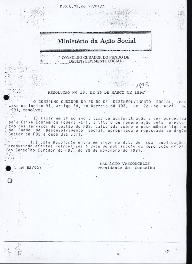 - RESOLUÇÃO Nº 17, DE 26 DE MARÇO DE 1992 - Aprova, para o exercício de 1992, a proposta orçamentária do FDS que passa a fazer parte integrante desta Resolução.