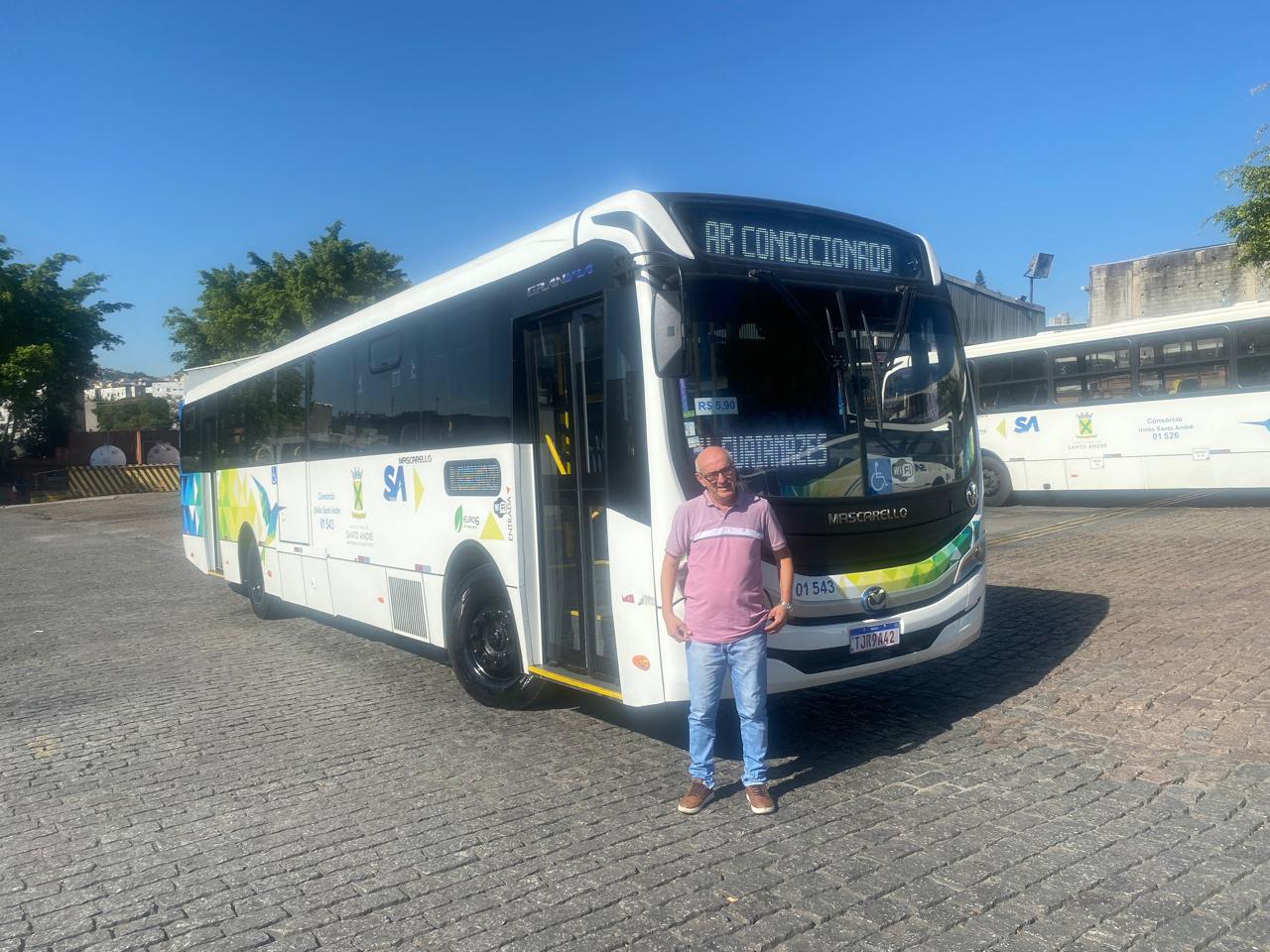 - Wagner e um dos ônibus que desembarcaram em Santo André via renovação de frota. Crédito: Arquivo Pessoal.