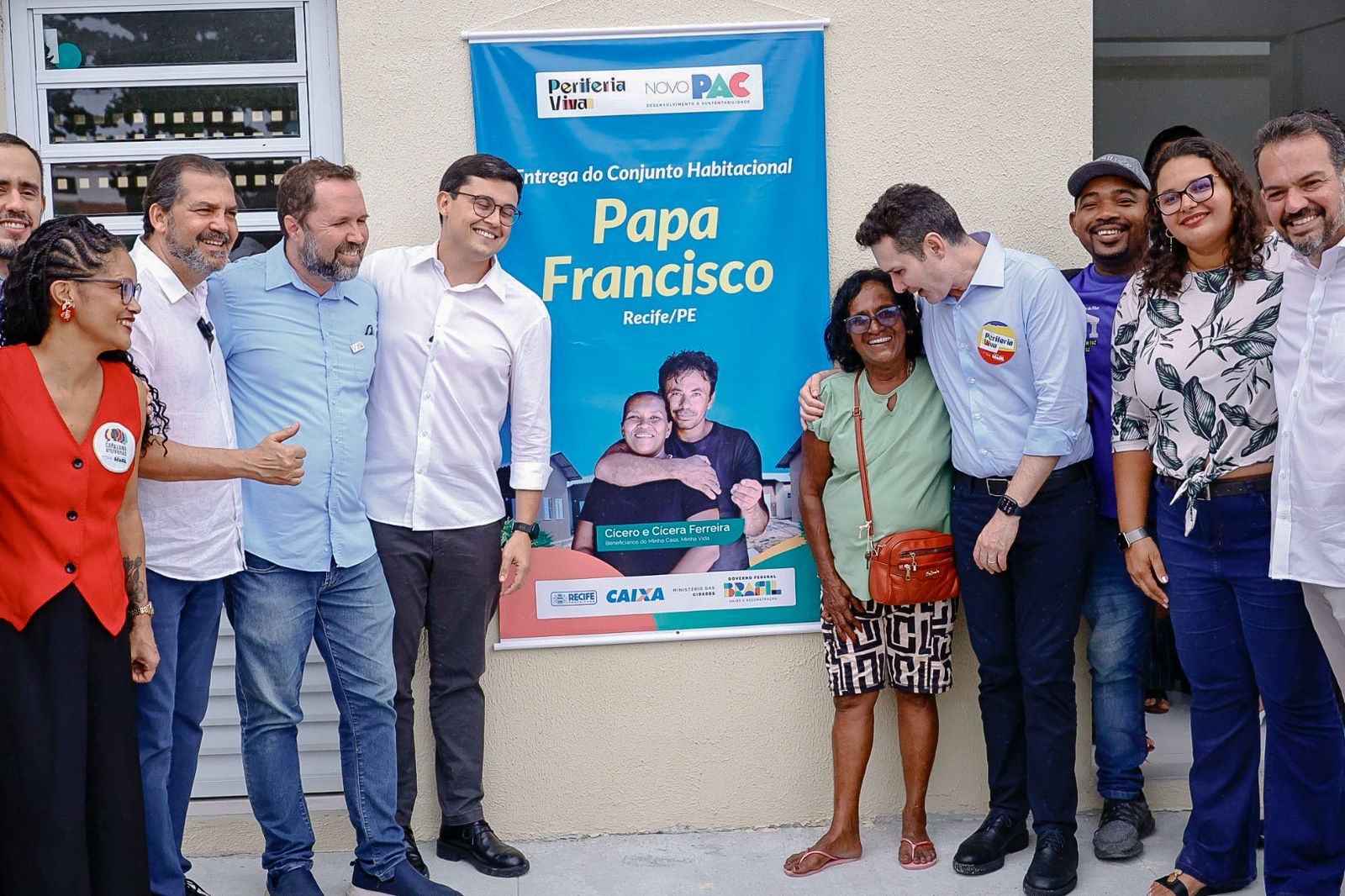 Localizado no centro histórico de Recife, o Conjunto Habitacional Papa Francisco, na Comunidade do Pilar, foi entregue à população, nesta quinta-feira (14). Ao lado do presidente Lula, o ministro das Cidades, Jader Filho, participou da cerimônia de entrega simbólica de chaves. Na mesma ocasião, as famílias da comunidade de Brasília Teimosa receberam 599 títulos de regularização fundiária.