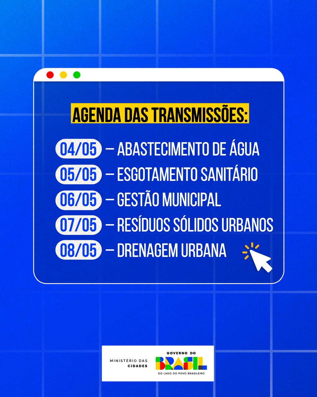 O primeiro módulo temático será sobre abastecimento de água, apresentado na segunda-feira (4/5). Em sequência, as demais transmissões serão sobre esgotamento sanitário (5/5), gestão municipal (6/5), resíduos sólidos urbanos (7/5) e drenagem e manejo de águas pluviais urbanas (8/5).