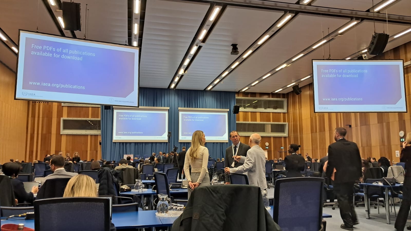 Embaixadora Claudia Vieira Santos (de pé), representante permanente do Brasil junto à AIEA. e chefe da delegação brasileira, conversa com o presidente da CNEN, Francisco Rondinelli. (Foto: Dean Calma / AIEA)