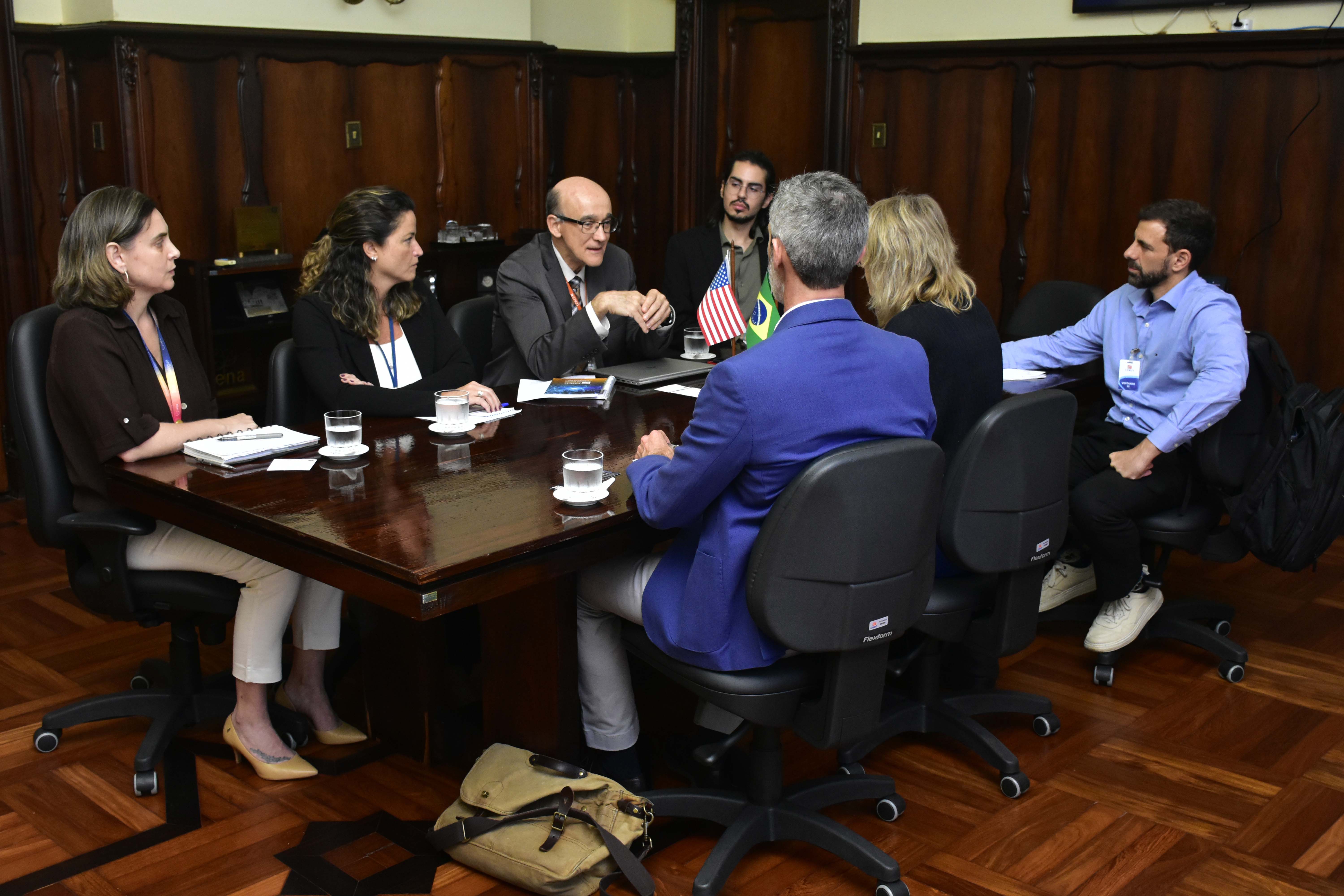 Da esquerda para a direita, conselheiro da Embaixada da França; o presidente Rondinelli; a embaixadora Claudia Vieira Santos; o diretor-geral de Desenvolvimento Nuclear e Tecnológico da Marinha Almirante Alexandre Rabello de Faria e o Secretário Naval de Segurança Nuclear e Qualidade Almirante Petrônio Augusto Siqueira de Aguiar.