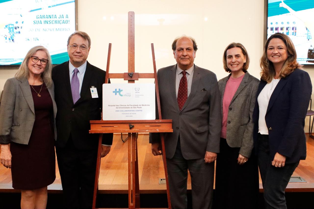 Da esquerda para a direita, Heloisa de Andrade Carvalho, coordenadora médica do Serviço de Radioterapia do Instituto de Radiologia; Carlos Malamut, representante regional CNEN de projeto Arcal; presidente da CNEN, Francisco Rondinelli Júnior; Gabriela Borsato, coordenadora-geral de Aplicações das Radiações Ionizantes CNEN; Joana Azambuja, coordenadora de Relações Internacionais da CNEN e oficial de ligação junto à AIEA.