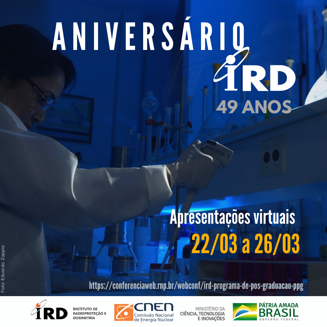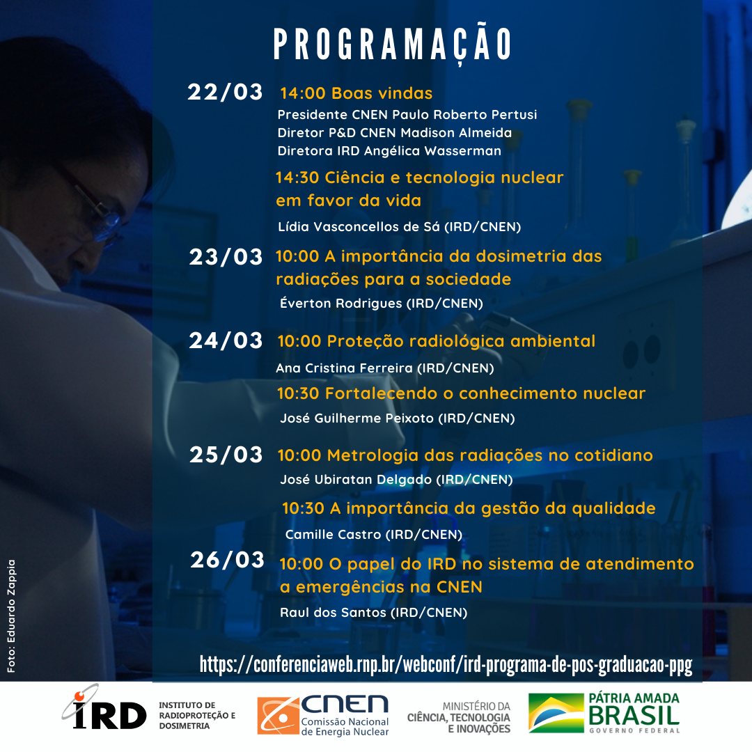 “Este modelo possibilita um acolhimento maior: poderemos interagir, nessa data tão preciosa, com a sociedade, ampliando sua percepção de alguns aspectos do setor nuclear e o papel do nosso instituto para o setor, ao mesmo tempo, carregando de significado, para não especialistas, palavras como radioproteção e dosimetria, entre outras. Uma outra forma de visita virtual institucional”. Na abertura da semana, ela recebe o presidente da CNEN Paulo Roberto Pertusi e o diretor de Pesquisa e Desenvolvimento da Comissão, Madison Coelho de Almeida. O evento, de livre acesso para o grande público, será veiculado na plataforma da Rede Nacional de Ensino e Pesquisas ( https://conferenciaweb.rnp.br/webconf/ird-programa-de-pos-graduacao-ppg ).