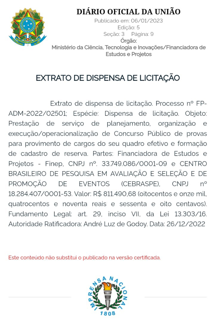 A Comissão Nacional de Energia Nuclear (CNEN) informa que não assinou dispensa de licitação com o Centro Brasileiro de Pesquisa em Avaliação e Seleção e de Promoção de Eventos (CEBRASPE) para a realização de concurso público em 2023. Na verdade, o órgão que assinou a referida dispensa foi a Financiadora de Produtos e Projetos (FINEP).