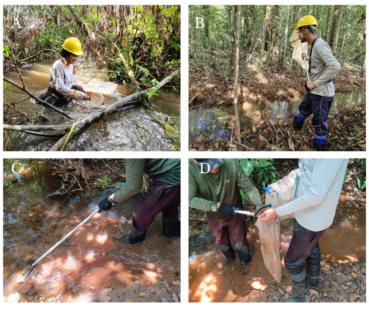 - (A) Coleta de Heteroptera; (B) coleta de Odonata; (C) coleta de imaturos de EPT; (D) acondicionamento das amostras de EPT juntamente com o substrato em saco plástico, para triagem posterior - Foto: Leandro Juen/LABECOUFPA