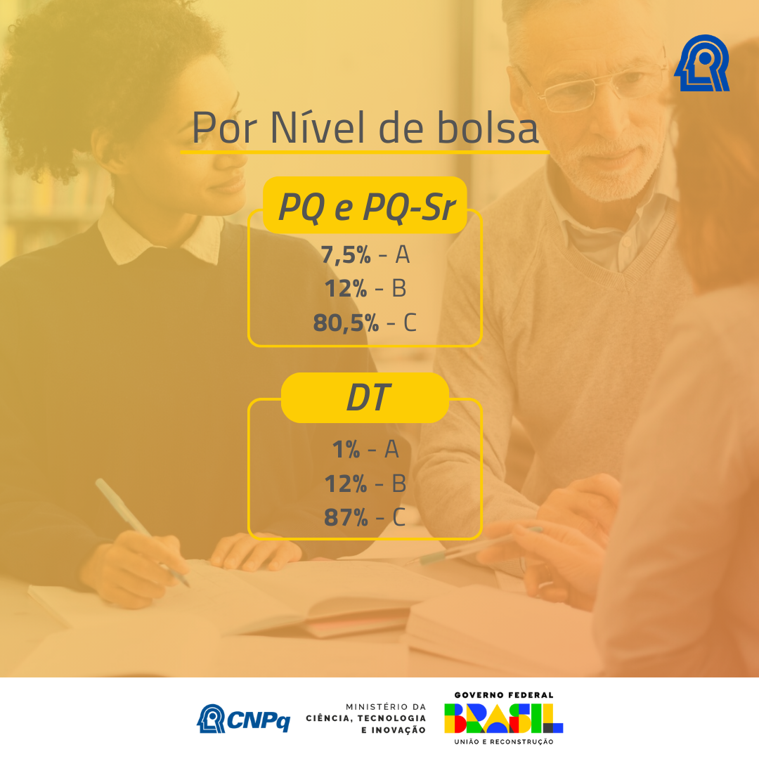 O resultado indica a concessão de 1.009 bolsas além do previsto, permitindo uma significativa renovação do quadro total, que é de cerca de 16 mil bolsistas. Do total de bolsas PQ e PQ-Sr aprovadas, 7,5% são de nível A; 12% de nível B; e 80,5% de nível C. Para as bolsas DT, os percentuais foram de 1%, 12% e 87%, respectivamente.