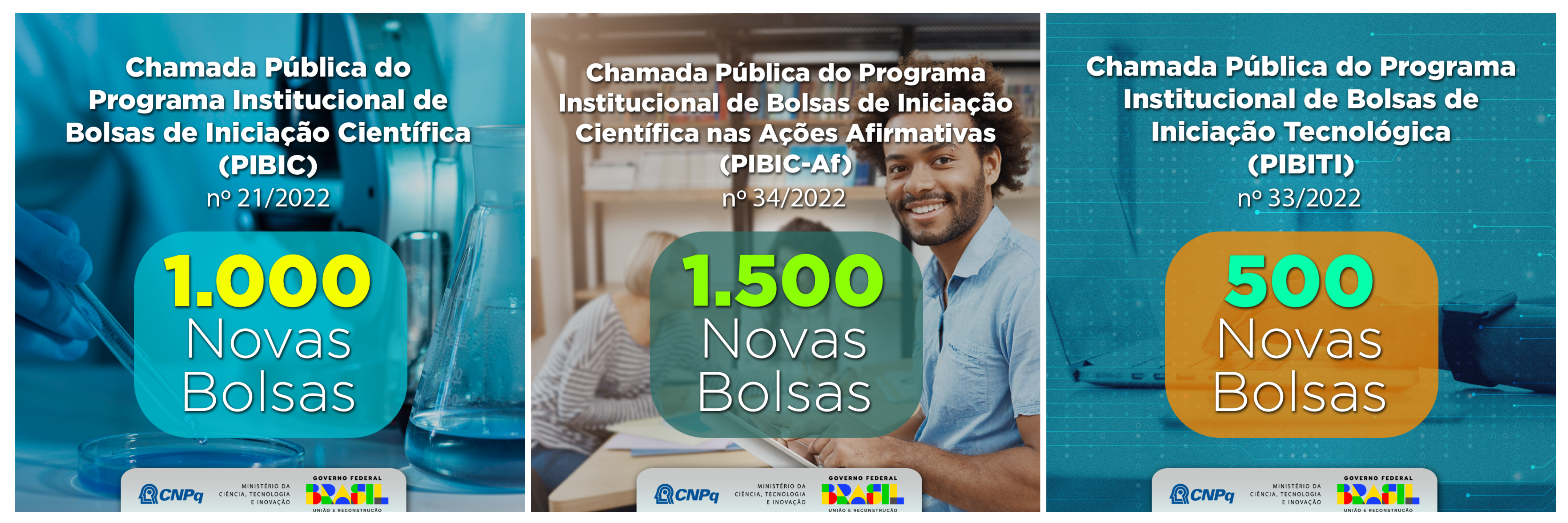 O Conselho Nacional de Desenvolvimento Científico e Tecnológico (CNPq) anuncia a concessão de mais 3.000 novas Bolsas para os Programas Institucionais de Iniciação Científica e Tecnológica , especificamente para PIBIC , PIBIC-Af e PIBITI . Essas bolsas serão concedidas às Instituições de Ensino Superior (IESs) e de Pesquisa no 2º ciclo da edição 2022-2024 dos Programas. Os bolsistas indicados participarão dos projetos por um período de 12 meses, de 1º de setembro de 2023 a 31 de agosto de 2024.