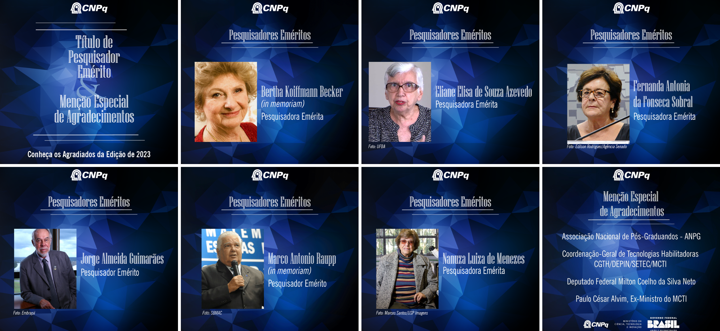 Conselho Nacional de Desenvolvimento Científico e Tecnológico (CNPq) divulga os homenageados com o Título de Pesquisador Emérito e a Menção Especial de Agradecimentos. Os nomes são escolhidos pelo Conselho Deliberativo do CNPq, composto por pesquisadores e pesquisadoras, representantes instituições públicas e privadas e da comunidade científica.