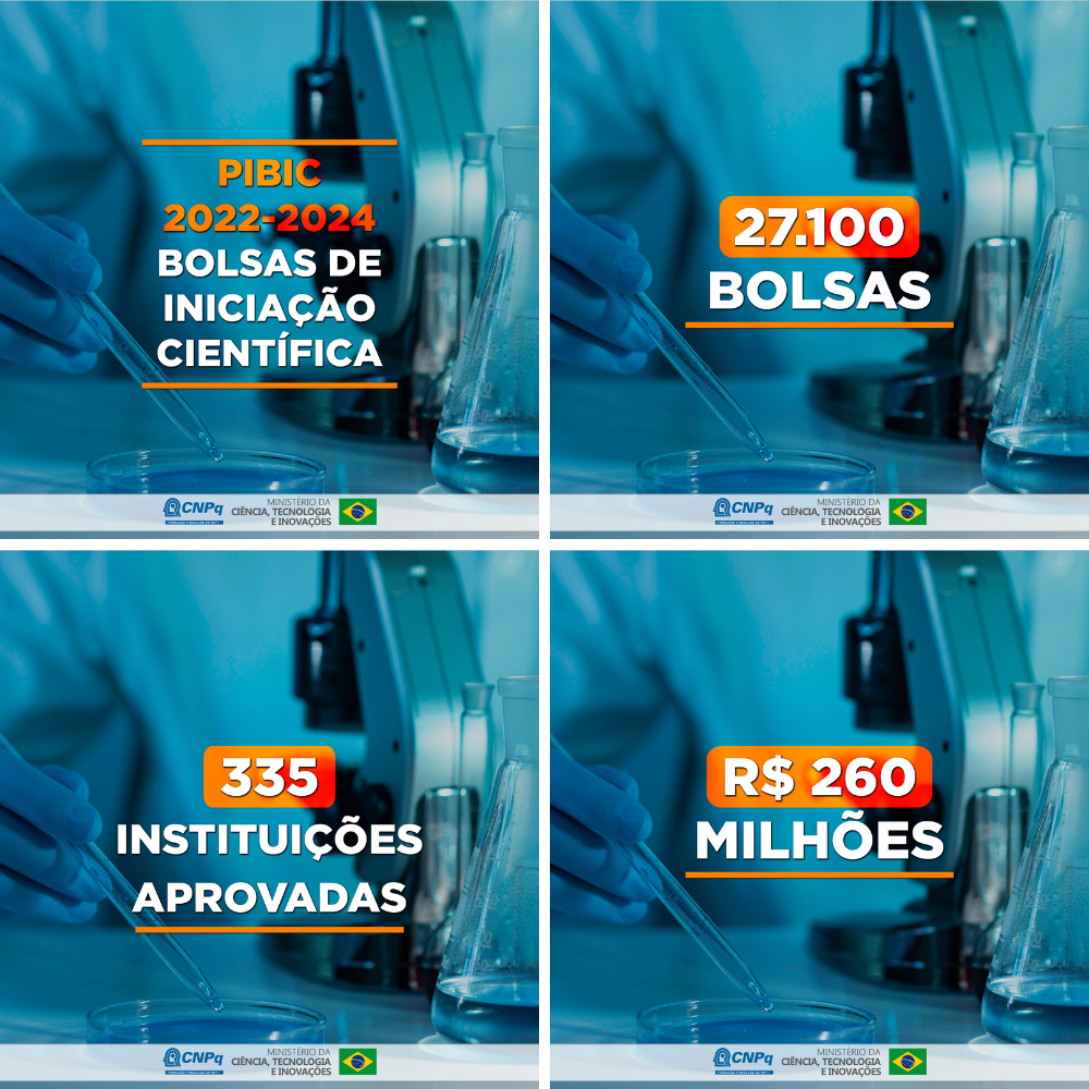O Conselho Nacional de Desenvolvimento Científico e Tecnológico (CNPq) divulga nesta terça-feira, 6, o resultado final da Chamada PIBIC nº 21/2022 - Programa Institucional de Bolsas de Iniciação Científica 2022-2024. Foram contempladas 335 instituições - cerca de 97% das instituições proponentes - e, das 26.100 bolsas inicialmente previstas, houve um acréscimo de 1.000 bolsas, totalizando 27.100 bolsas para a edição 2022-2024 do Programa PIBIC.