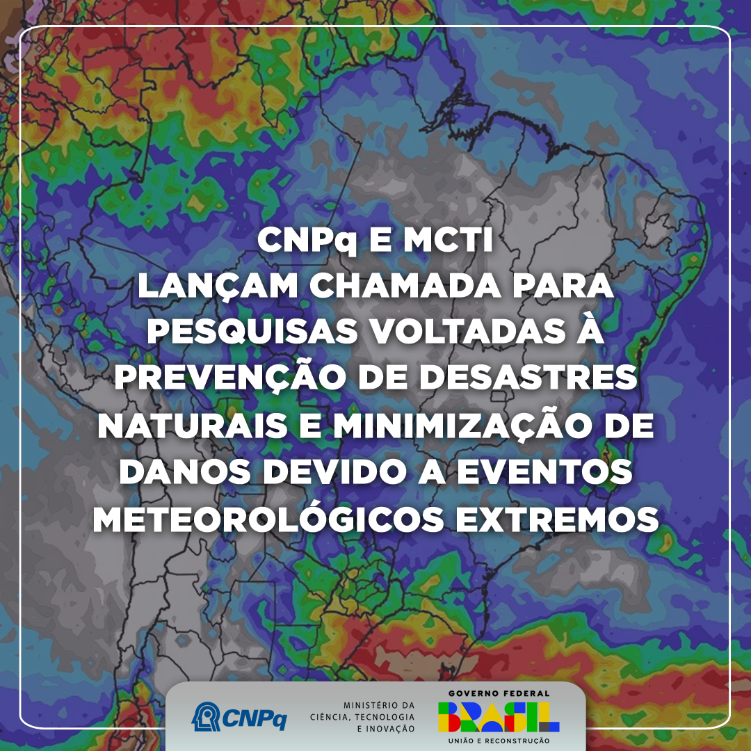 Está aberto até o dia 18 de outubro de 2023 o prazo para submissão de propostas à Chamada CNPq/MCTI Nº 15/2023 - Eventos Meteorológicos Extremos: Prevenção de Desastres Naturais e Minimização de Danos. A Chamada visa apoiar projetos de pesquisa que contribuam de forma significativa para o desenvolvimento científico e tecnológico e a inovação do Brasil, em tema relacionado à dinâmica dos processos atmosféricos capazes de desencadear eventos meteorológicos extremos, de curto ou curtíssimo prazos temporais e limitada escala espacial, focando no desenvolvimento de ferramentas que subsidiem a emissão de alertas de risco para inundações e deslizamentos decorrentes de eventos hidrológicos e geodinâmicos, de forma a prevenir desastres naturais e a minimizar seus danos. Os projetos contemplados serão financiados com recursos no valor global de R$ 11,93 milhões, recursos do Ministério da Ciência, Tecnologia e Inovação (MCTI) e do Conselho Nacional de Desenvolvimento Científico e Tecnológico (CNPq) em três parcelas, nos exercícios financeiros de 2023, 2024 e 2025.