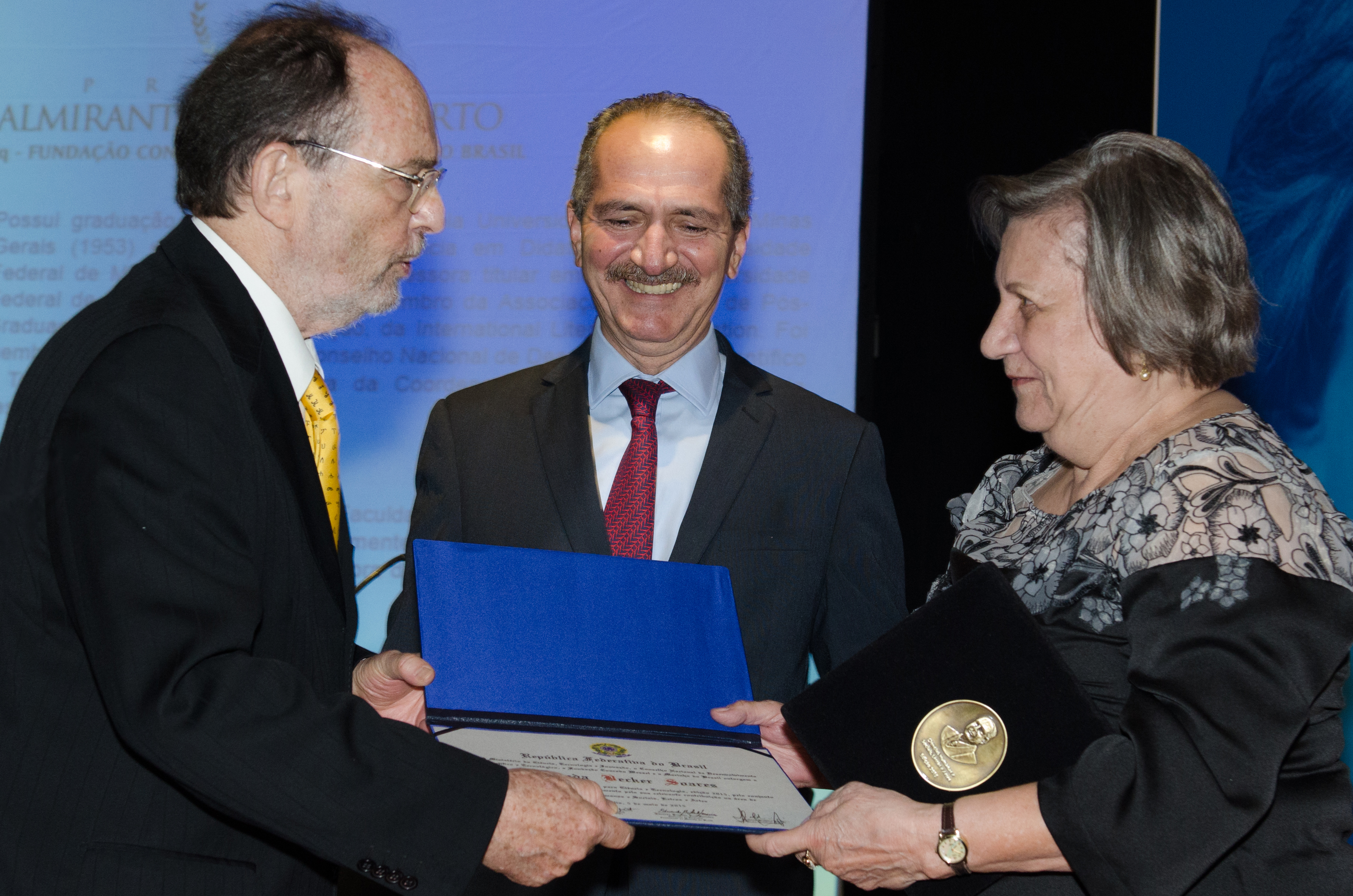 Profº Magda Soares recebendo o Prêmio Almirante Álvaro Alberto do CNPq, em 2015. Foto: ACS/CNPq