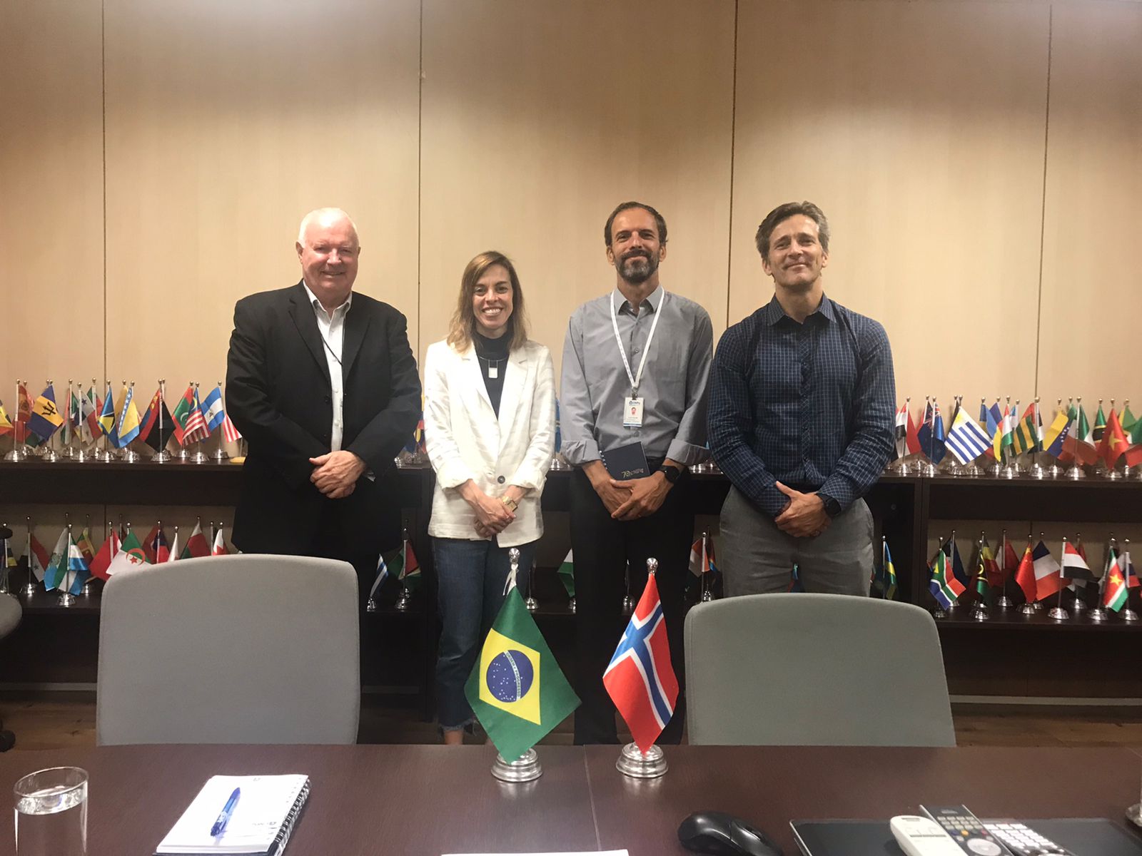A comissão da Embaixada da Noruega, composta pelo Conselheiro de Ciência, Tecnologia e Educação Superior da Embaixada da Noruega, Torkjell Leira, e Joana Brauer, Assessora de Cultura, Educação, Direitos Humanos e Comunicação da Embaixada da Noruega, foi recebida pelo coordenador-geral de Cooperação Internacional do CNPq, Lélio Fellows e pelo coordenador substituto da Coordenação de Negociação, Assessoramento e Estudos Internacionais do CNPq, Flávio Velame.