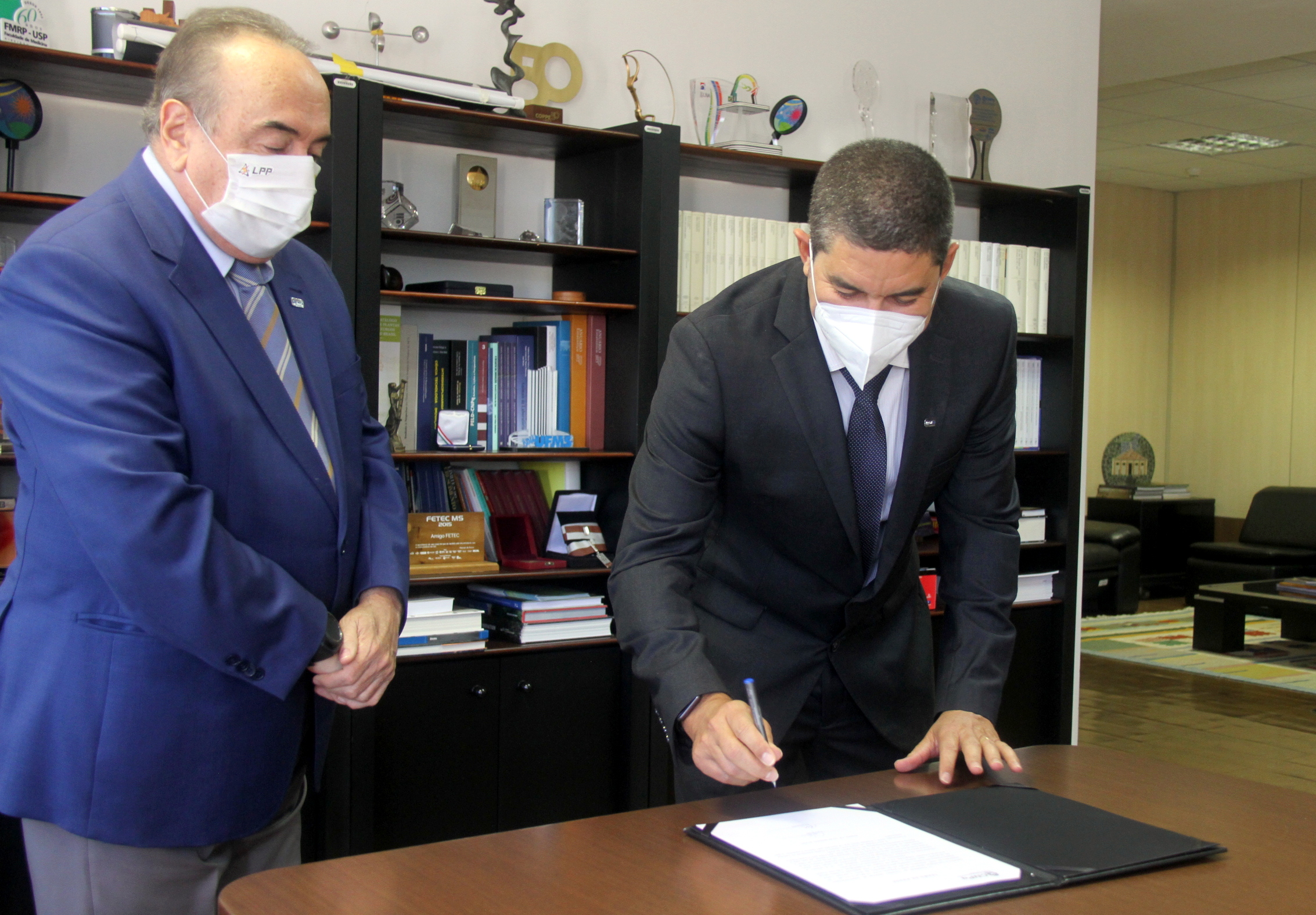 Prof. Carlos Alberto Pereira dos Santos (à esquerda) assina termo de posse ao lado do Prof. Evaldo Vilela. Foto: Marcelo Gondim