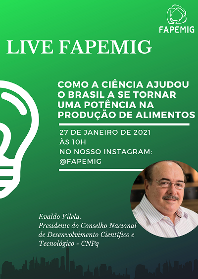 Para debater o assunto, a FAPEMIG irá realizar, no dia 27 de janeiro, às 10h, a live Como a ciência ajudou o Brasil a se tornar uma potência na produção de alimentos . O evento acontecerá no perfil do Instagram da FAPEMIG ( @fapemig ) e contará com a participação do presidente do Conselho Nacional de Desenvolvimento Científico e Tecnológico ( CNPq ), Evaldo Vilela.