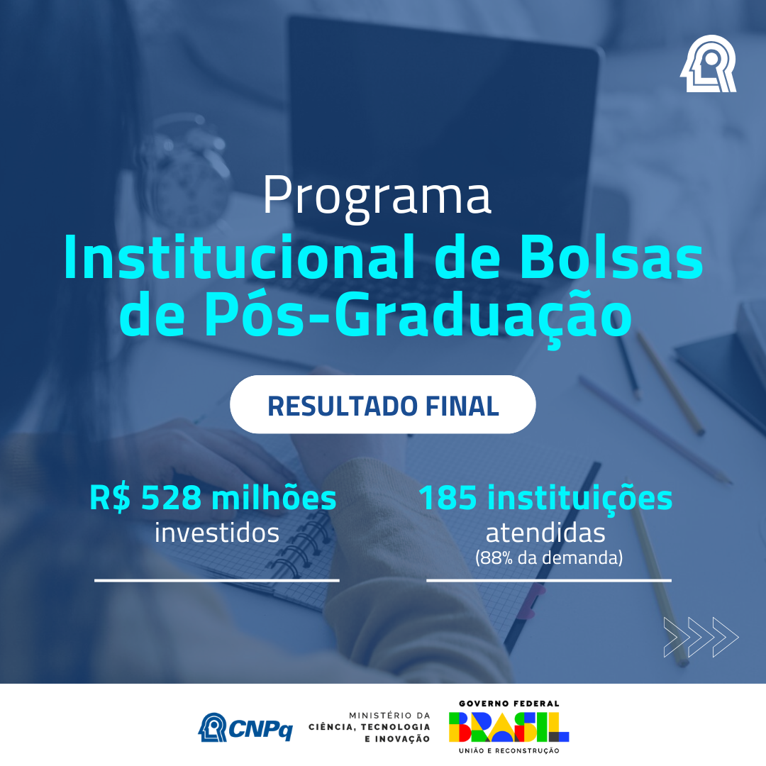 O Conselho Nacional de Desenvolvimento Científico e Tecnológico (CNPq) divulga o resultado final da chamada nº 50/2024 do Programa Institucional de Bolsas de Pós-Graduação (PIBPG). Ao todo, 185 propostas de instituições foram aprovadas, com investimentos do orçamento do CNPq de mais de R$ 528 milhões – um acréscimo de R$ 98 milhões (23%) em relação ao previsto. Serão concedidas 6.175 bolsas, sendo 4.382 de mestrado e 1.793 de doutorado - cerca de mil bolsas além da previsão inicial.