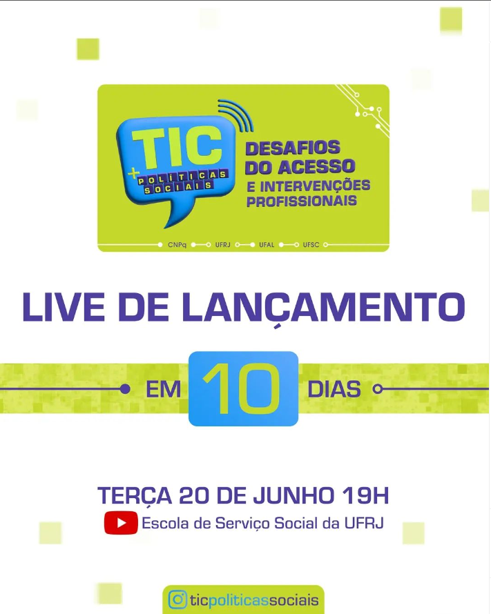 O projeto de Tecnologias da Informação e Comunicação (TIC) no dia 20 de junho às 19h, irá transmitir a live de lançamento do Projeto de Pesquisa em Rede: “Os desafios do acesso e das intervenções profissionais nas políticas sociais diante das tecnologias de Informação e de comunicação (TIC)”, no canal do Youtube da Escola de Serviço Social UFRJ. O projeto tem o apoio do Conselho Nacional de Desenvolvimento Científico e Tecnológico (CNPq).