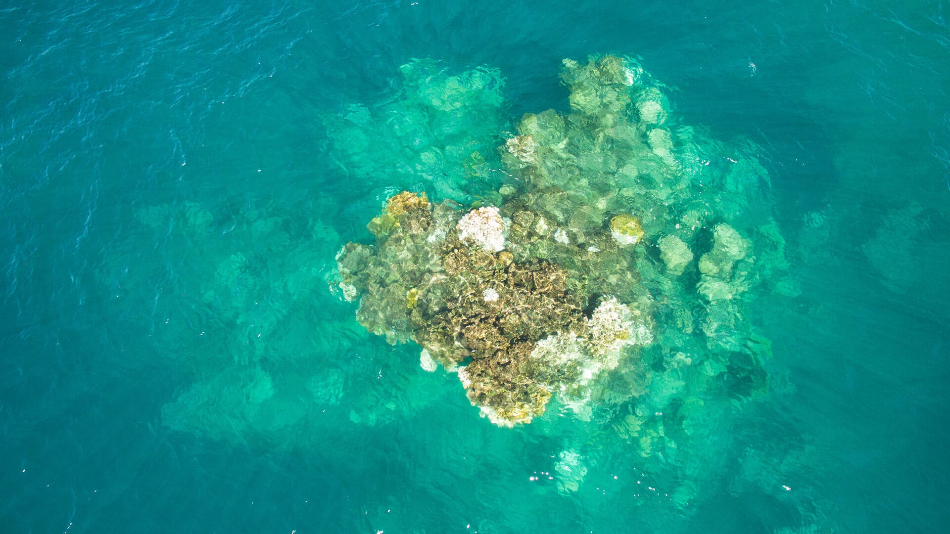 Foto aérea do Arquipélago de Abrolhos, região estudada pelo PELD Abrolhos. Esses estudos têm gerado e interpretado a mais longa série de dados sobre a cobertura dos maiores e mais biodiversos recifes do Atlântico Sul. Esses dados têm ajudado a avaliar os efeitos e a efetividade das Unidades de Conservação, e evidenciaram áreas e espécies mais sujeitas a estressores locais que podem e devem ser controlados, tais como dragagens próximas a recifes. Foto: Fernando Moraes (PELD Abrolhos)