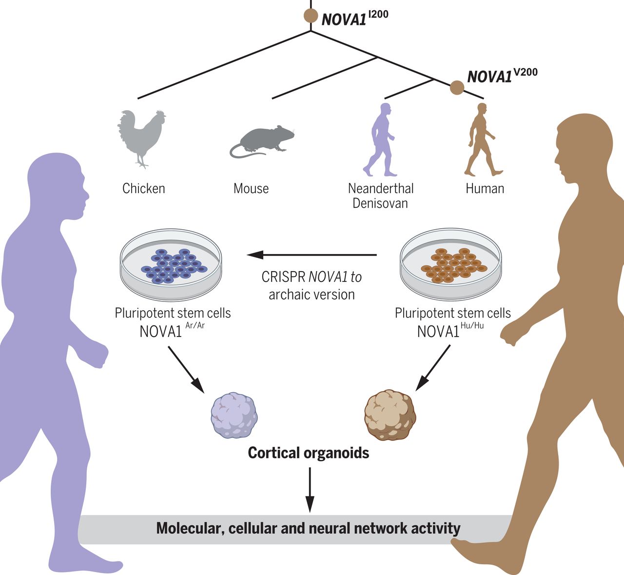 Estudos atuais sobre a evolução humana, baseados em análises de fósseis, indicam que existiram várias linhagens de hominídeos, mas apenas uma sobreviveu. Os Neandertais e os Denisovanos, duas dessas espécies extintas, são os que mais evoluíram e chegaram próximos aos humanos. A comparação entre os genomas dos Neandertais, dos Denisovanos e dos humanos já mostrou que muitos humanos hoje carregam genes do passado, o que permitiu uma enumeração de diferenças de características genéticas humanas específicas relevantes para a evolução humana. Ao comparar o genoma dos Neandertais e dos Denisovanos com os de humanos modernos, o professor Alysson Muotri notou várias distinções, como a existência ainda hoje, na população de certas regiões, de características do genoma arcaico. É possível que outros fragmentos tenham sido eliminados por seleção natural devido a alguma desvantagem adaptativa, seja na saúde, na fertilidade, na aparência ou na cognição. “No passado, já havíamos comparado organóides cerebrais de humanos com de outros primatas, como o chimpanzé. No entanto, para entender as origens do cérebro moderno, precisaríamos compará-los com o dos nossos primos evolutivos mais próximos, como os Neandertais.”, explica Muotri.
