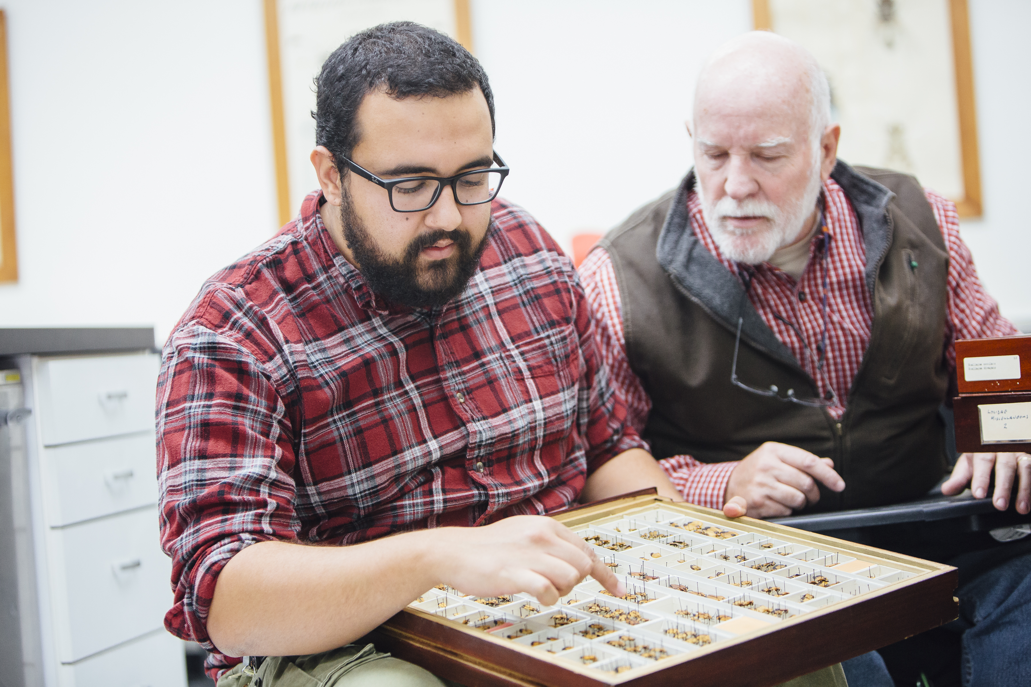 Vinicius Ferreira (esquerda) e Michael A. Ivie (direita) estudando besouros da família Lycidae na Montana State University. Instituição onde a pesquisa foi desenvolvida e financiada pelo CNPq. Crédito da foto: Adrian Sanchez-Gonzalez.