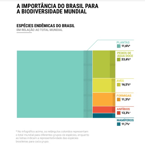 O Brasil é tão importante pra biodiversidade mundial, que 24% de todas as espécies de peixes de água doce do mundo ocorrem aqui. Assim, como 17% das espécies de aves e 13% das de anfíbios.