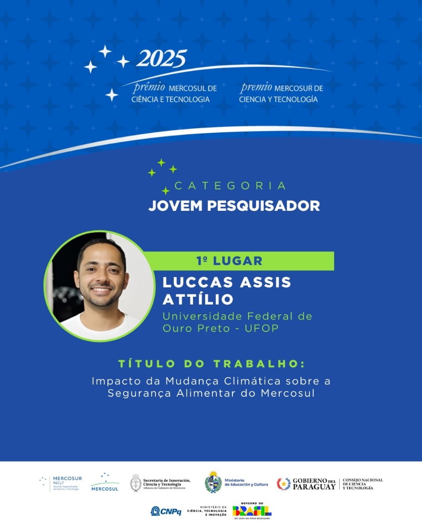 Luccas Attílio, primeiro lugar na categoria jovem pesquisador, por sua vez, salienta que o Prêmio Mercosul mostra que os produtos gerados pelas universidades e pela pesquisa devem contribuir com a sociedade. “Essa premiação mostrou que eu estou na direção correta a respeito de meus esforços, estudo, disciplina, consistência e pesquisa. O prêmio mostra que minha pesquisa está antenada com os desafios atuais e com as necessidades da sociedade. A vida acadêmica é permeada por várias dificuldades e obstáculos (e rejeições!) – e vencer um prêmio dessa grandeza ajuda a continuar essa caminhada”, diz ele, para quem as mudanças climáticas podem exacerbar desafios atuais, em especial a falta de segurança alimentar em determinados estratos da sociedade.”Minha agenda de pesquisa é sobre os efeitos da mudança climática e da transição energética sobre a sociedade e como políticas públicas podem mitigar efeitos colaterais produzidos pela mudança climática”, explica Attílio. Ele diz que incorporou o tema da mudança climática no estudo de agregados macroeconômicos porque percebeu que a economia é um dos elementos que gera e promove a mudança climática. Attílio foi agraciado com o trabalho Impacto da Mudança Climática sobre a Segurança Alimentar do Mercosul, que aponta a vulnerabilidade dos países do Mercosul frente à mudança do clima.