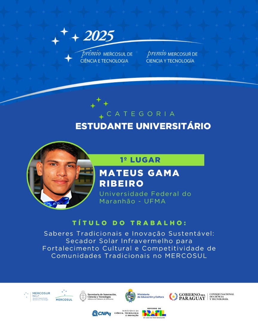 Para Mateus Gama Ribeiro, sua escolha para o primeiro lugar na categoria Estudante Universitário é um marco científico, social e pessoal. Ele foi contemplado com a pesquisa "Saberes Tradicionais e Inovação Sustentável: Secador Solar Infravermelho para Fortalecimento Cultural e Competitividade de Comunidades Tradicionais no Mercosul" e lembra que a premiação fortalece a credibilidade do projeto, ao reconhecer de forma internacional uma tecnologia que nasceu da escuta dos pescadores e ao demonstrar que a ciência produzida no Maranhão gera impactos concretos e valoriza saberes tradicionais. “Esse reconhecimento também abre portas para investimentos e parcerias, fundamentais para levar a tecnologia às comunidades que mais precisam. A pesquisa já deu origem à startup TABA, contemplada no edital FAPEMA/SECTI, comprovando o potencial de transformar um protótipo acadêmico em solução de mercado com impacto social”, observa.